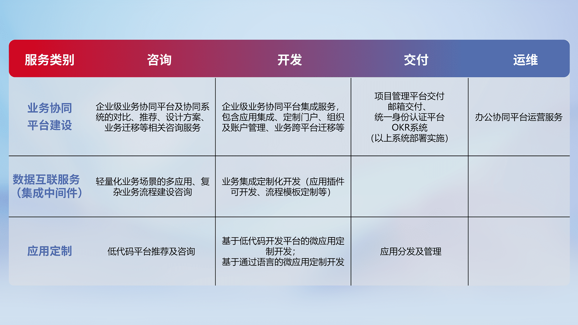 针对钉钉、、、企微、、、IDaas等平台级产品提供产品的规划、、方案、、交付、、、、定制化开发等服务,,,实现如统一协同办公、、、、智能客户服务、、、混合会议管理、、、、智能数据查询、、等业务场景,,,,实现数字化转型。。